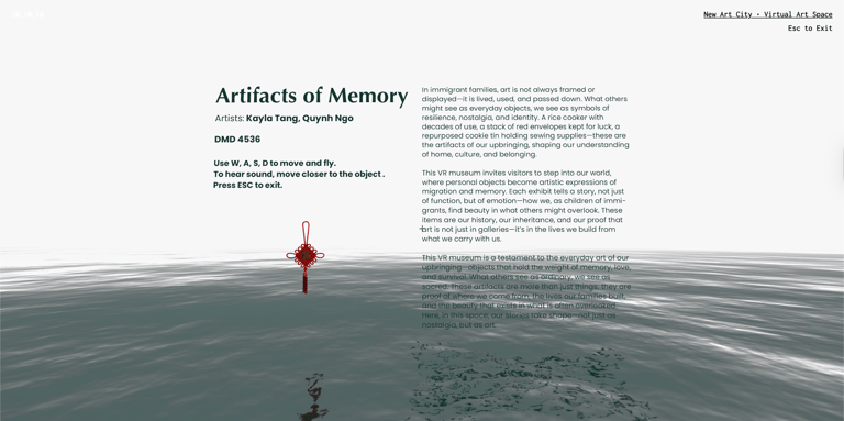 Artifacts of Memory is a virtual museum that honors the beauty and weight of the everyday. Each object in the space carries stories of love, survival, and cultural heritage. What others might overlook, we present as sacred — proof of the lives our families built and the memories that shape us.